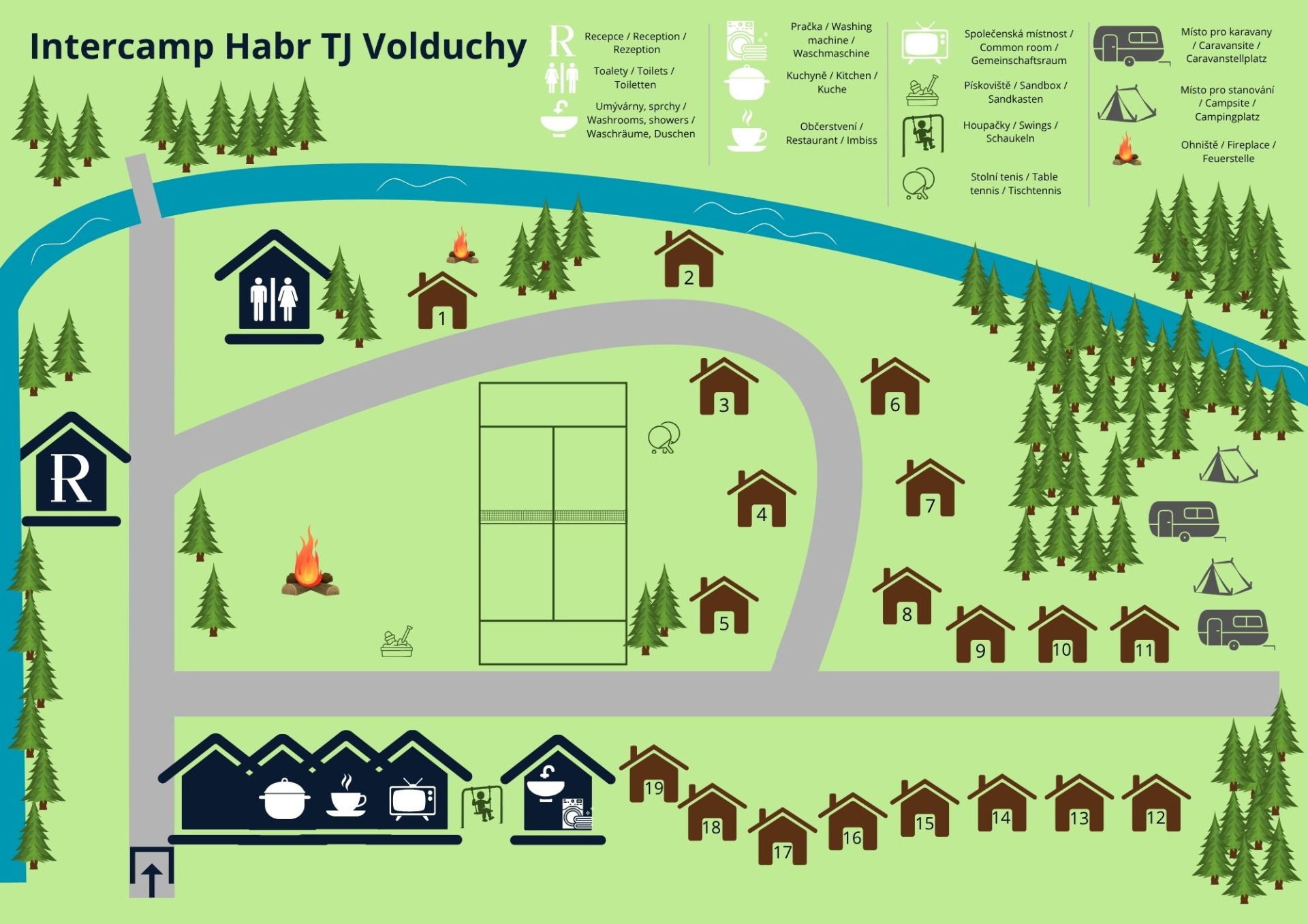 V kempu najdete občerstvení, WC, umývárny, sprchy s teplou vodou po celý den, vybavenou kuchyň, pračku, travnaté hřiště pro sportovní aktivity (samozřejmostí je možnost zapůjčení sportovního vybavení) a centrální ohniště pro večerní posezení u táboráku.